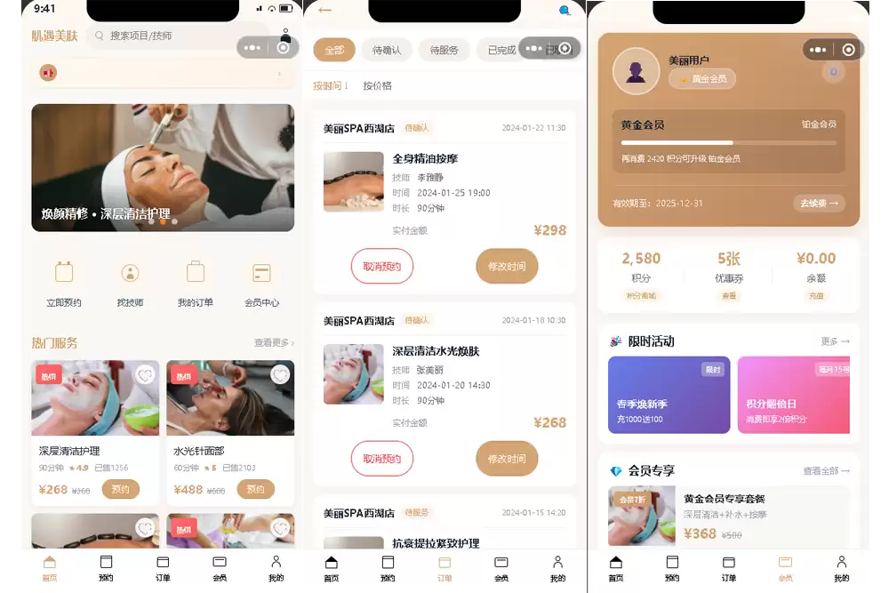 从用户触达的第一站到预约完成的闭环,德材翌科技为“肌遇美护”搭建了12大核心页面,覆盖从浏览、选择到支付、管理的全流程需求: