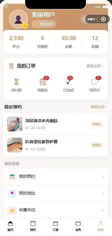德材翌科技将该页面设计为“分类标签+详情卡片”结构,支持用户按“待确认/待服务/已完成/已取消”筛选订单,每条记录清晰展示项目名称、技师、时间、金额及状态。操作按钮(取消预约、修改时间、核销)置于显眼位置,配合德材翌科技优化的核销码展示,方便到店核验。