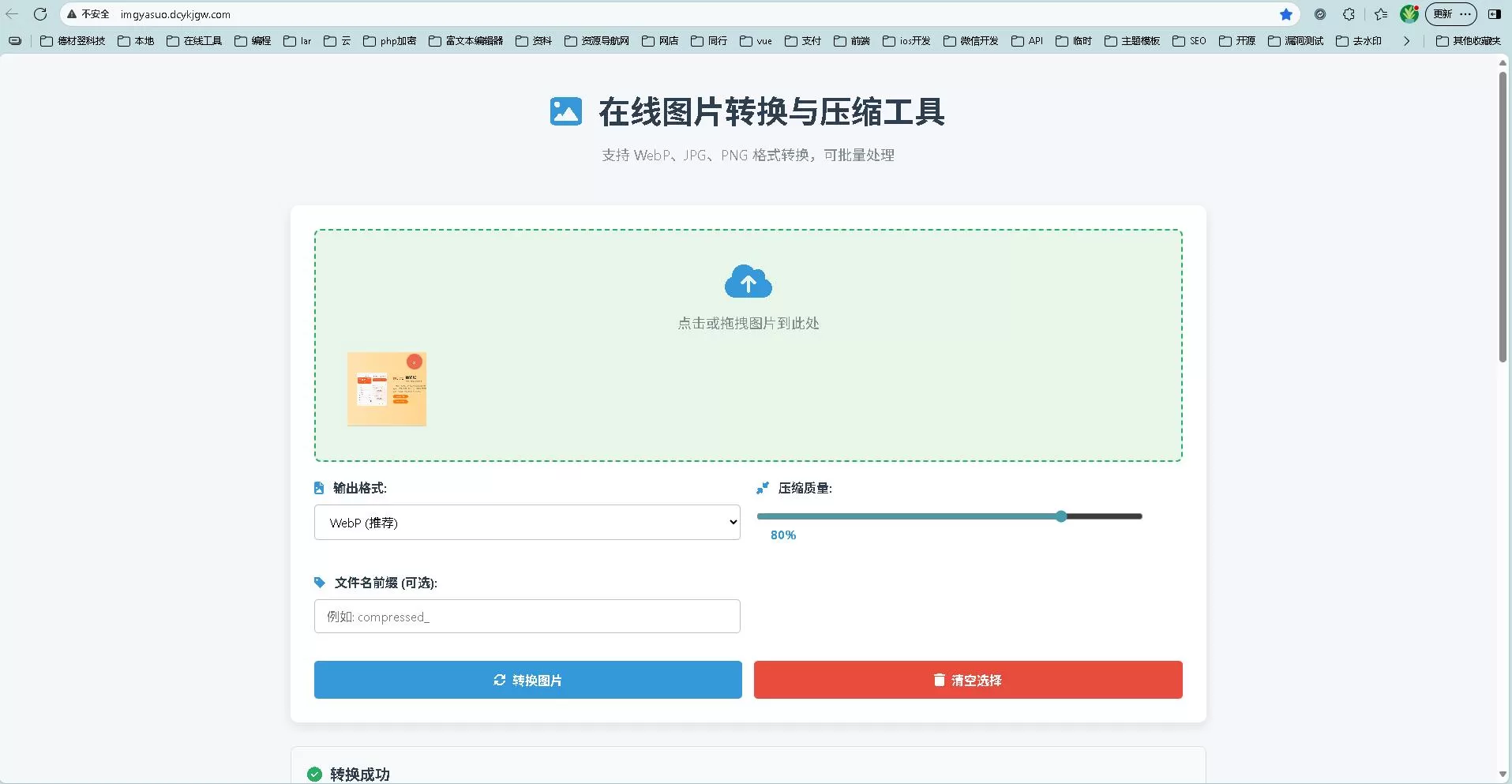 点击或拖拽图片到"点击或拖拽图片到此处",然后选择"输出格式"和"压缩质量";