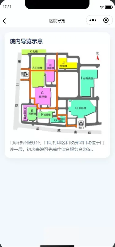 针对患者到院后不熟悉环境的问题,小程序中加入了院内导航功能,帮助用户快速了解院区分布、重点区域位置及就诊路线,进一步优化线下就诊体验。